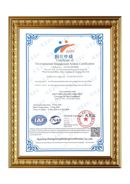 Standardowy:ISO14001 Liczba:42525E10079R0S Data wydania:2025-05-12 Data ważności:2028-05-11